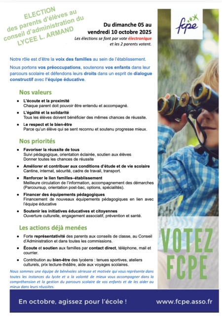 Chaque année les délégués de parents au conseil d'administration sont élus par l'ensemble des parents. La représentation est proportionnelle au nombre de voix exprimées sachant que chaque parent dispose d'une voix.